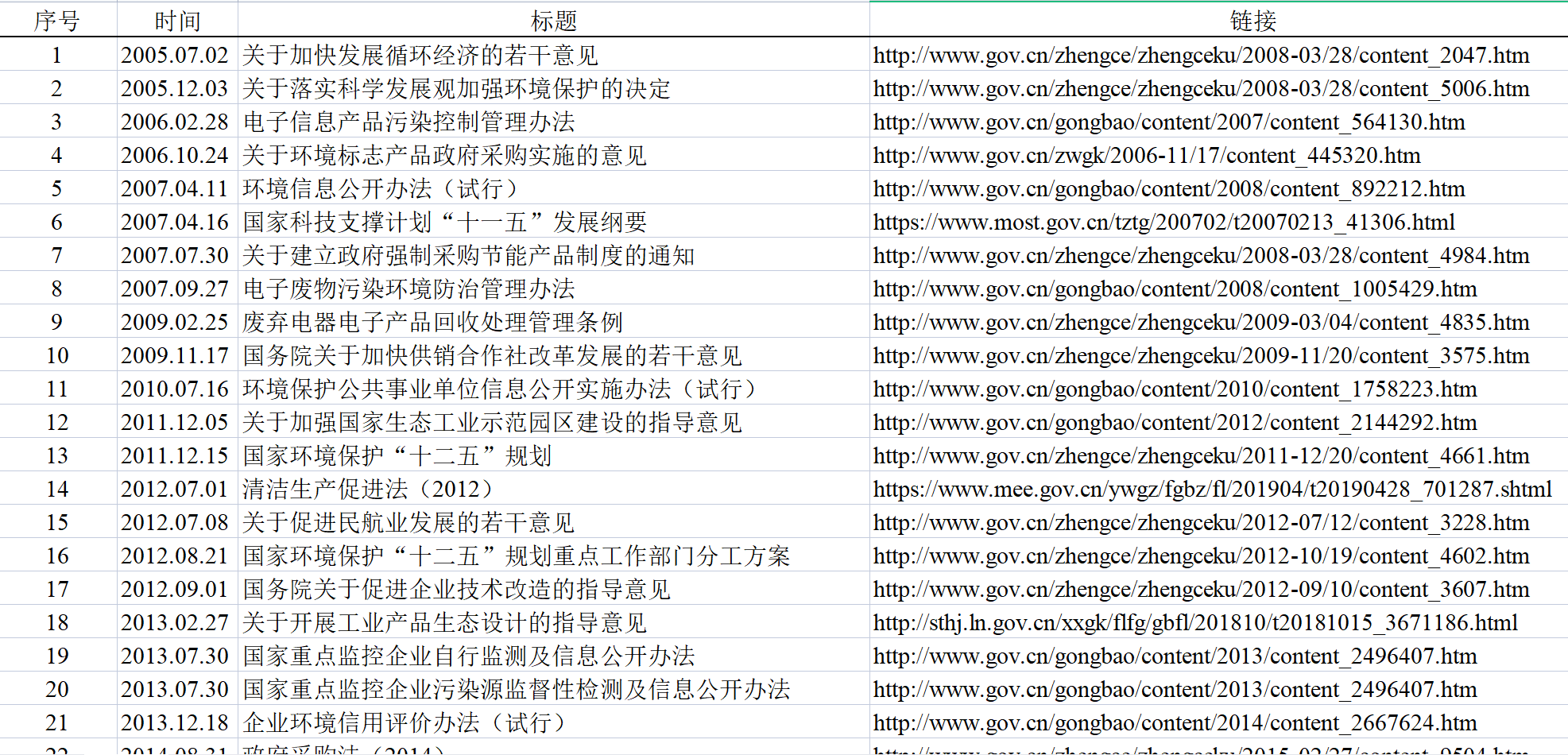 A collection of green supply chain management policies issued by 47 government management agencies in China, including national laws, the State Council regulations, regulations of the State Council and ministries. The database can query the file name, release time, release institution and original text link of each green supply chain management policy.