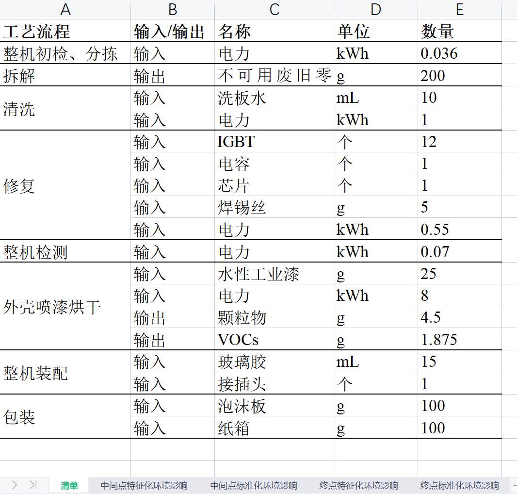 Through on-the-spot investigation on the remanufacturing project of control unit (ECU/TCU) of Baike Intelligent (Xiamen) Technology Co., Ltd., the life cycle list of the remanufacturing process of TCU was obtained. The database contains the input-output list based on the actual process and the quantitative results of environmental impact based on the intermediate point and the end point.