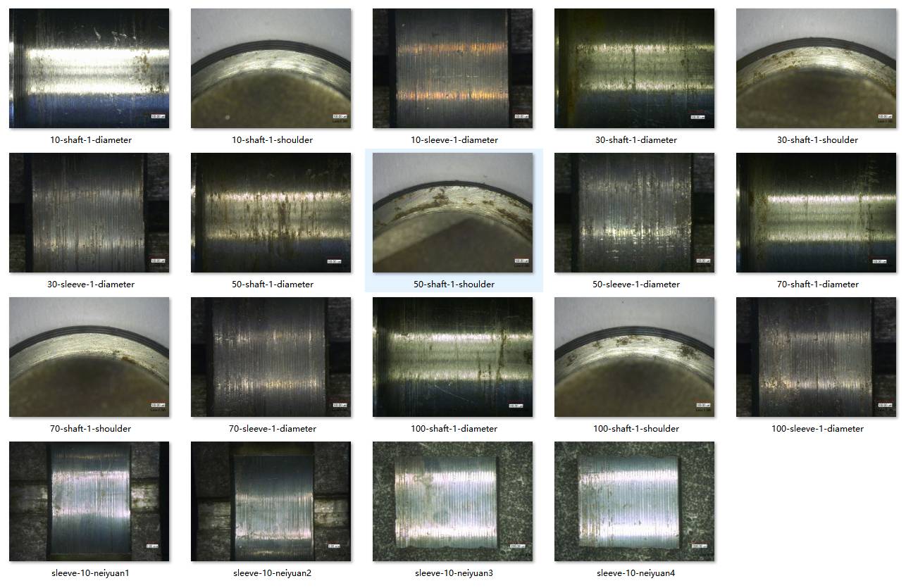 The equipment used for this data is the VHX-600E ultra-depth of field microscope produced by keyence Company with a magnification of 20x. The observation objects are the surface macro morphology of the fitting parts of small-size specimens, the main parts include the interference fitting surface of the shaft diameter, the contact surface of the shaft shoulder and the fitting surface of the shaft sleeve. Through observation, the surface damage of the specimen under different rotation times can be determined, and the damaged part can be determined for further observation.