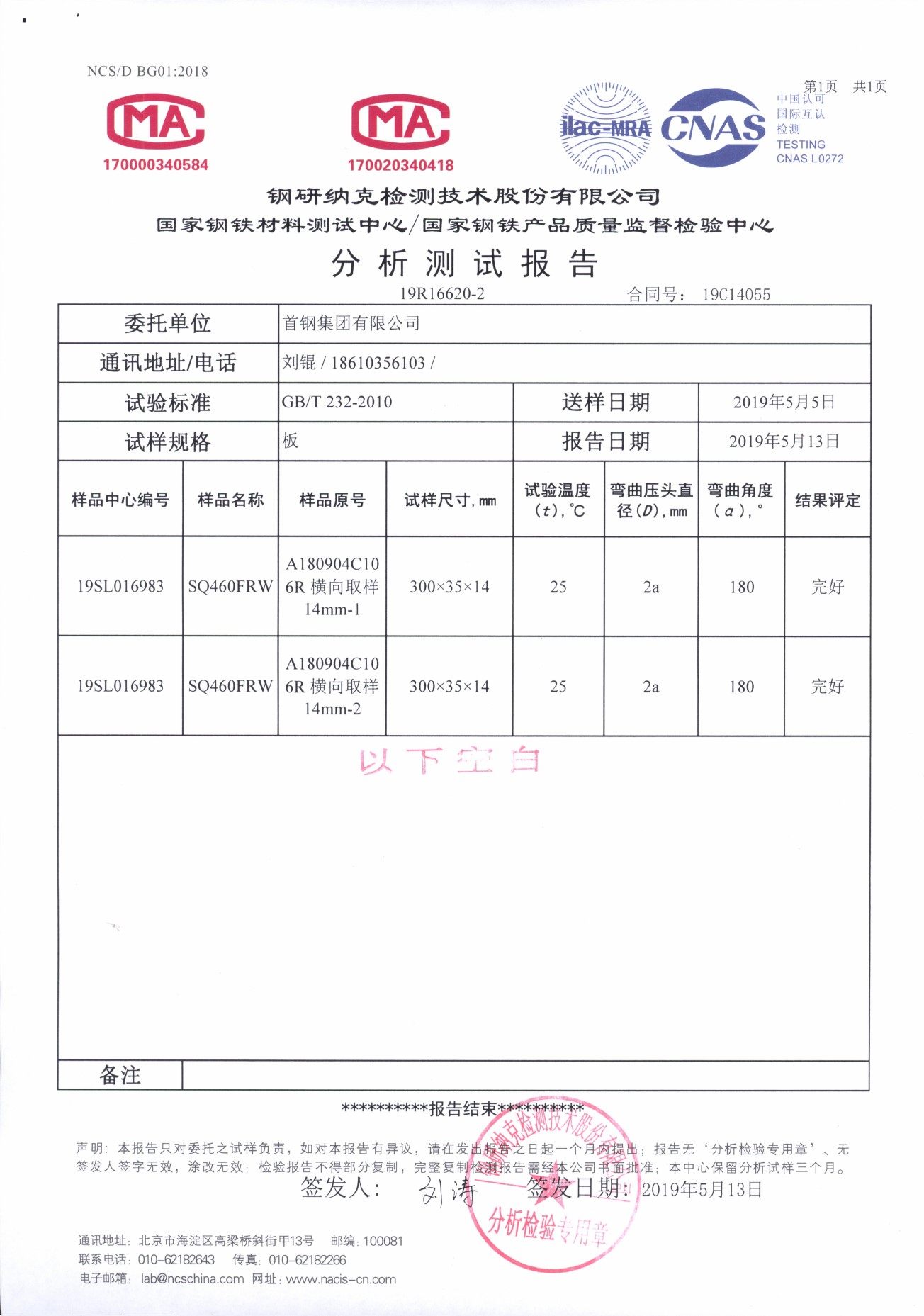 In order to meet the technical conditions of compressive strength ratio ≤0.83 and Rp0.2≥307MPa at 600℃ at the same time, the design target microstructure is ferrite + bainite, and the control cooling process is water cooling - air cooling - water cooling three-stage cooling mode. Ultra-fast cooling is used to make the strip enter the two-phase zone quickly, and the UFCT temperature and air cooling time are set to control the ferrite volume fraction. The coiling temperature of strip is controlled in bainite zone by cooling in the back layer to ensure that a large amount of bainite structure is obtained. The cold bending performance of 14mm plate of 460MPa aseismic corrosion resistant refractory steel in rolled state is: the bending head diameter is 2 times the thickness of steel plate, and the bending Angle is 180°, the sample is in good condition.