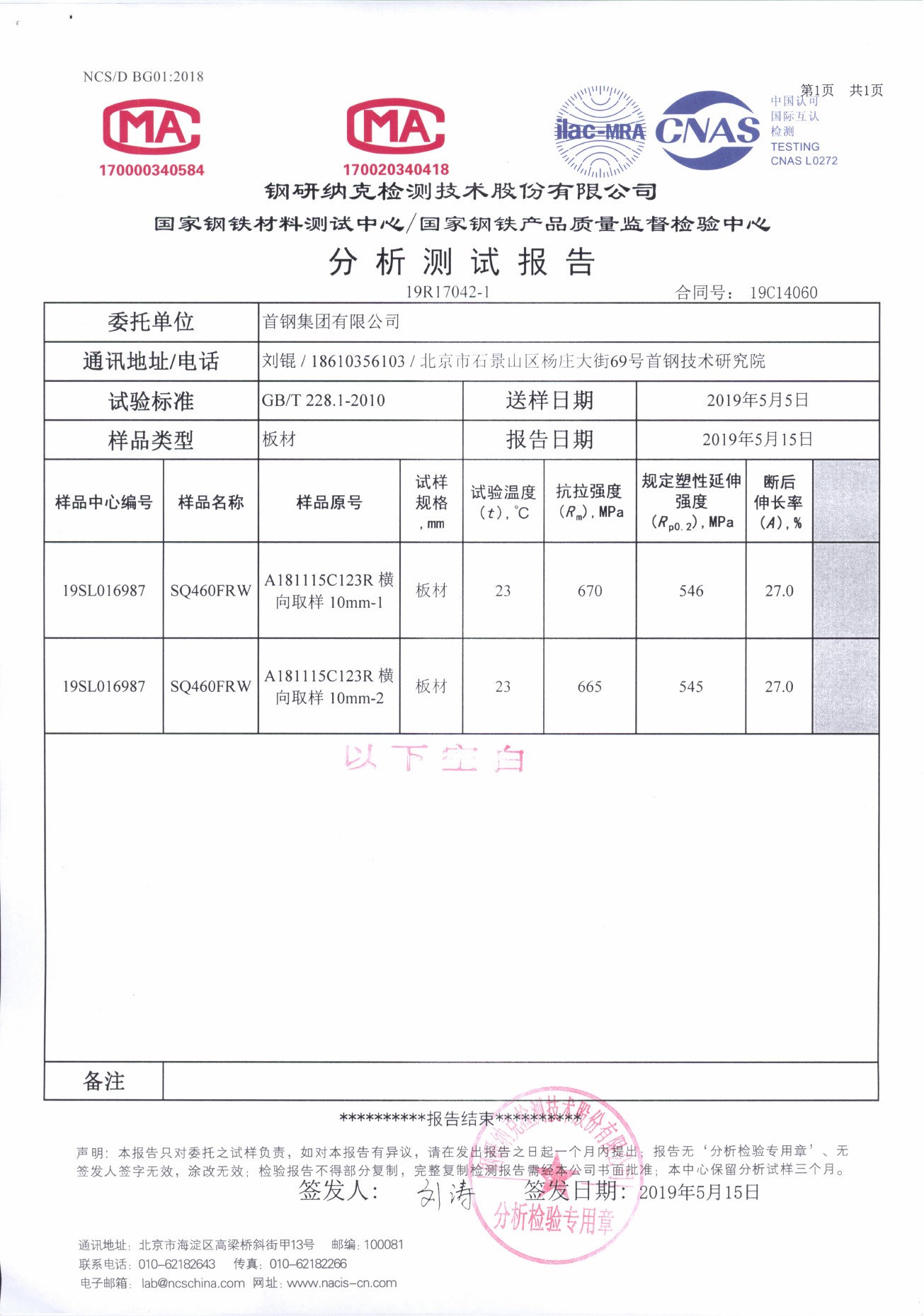In order to meet the technical conditions of compressive strength ratio ≤0.83 and Rp0.2≥307MPa at 600℃ at the same time, the design target microstructure is ferrite + bainite, and the control cooling process is water cooling - air cooling - water cooling three-stage cooling mode. Ultra-fast cooling is used to make the strip enter the two-phase zone quickly, and the UFCT temperature and air cooling time are set to control the ferrite volume fraction. The coiling temperature of strip is controlled in bainite zone by cooling in the back layer to ensure that a large amount of bainite structure is obtained. The tensile mechanical properties of 10mm steel sheet rolled at room temperature are 545MPa, 546MPa, 665MPa, 670MPa, 0.81, 0.82, and 27.0%, 27.0% elongation after fracture.