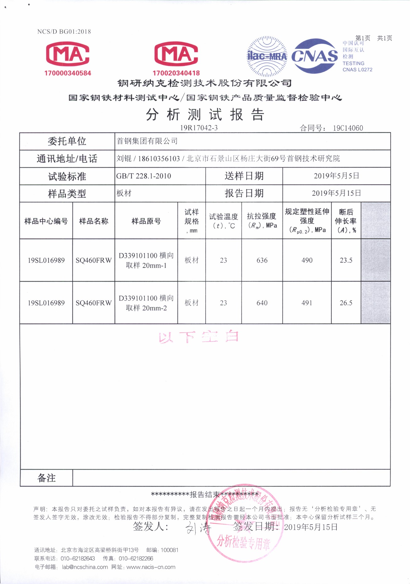 The data set is mainly used to test the tensile properties of 20mm 460MPa seismic corrosion resistant medium steel plate produced by Shougang at room temperature. The rolled specimens are tested at room temperature on a testing machine. The yield strength is 490-491mpa, the tensile strength is 636-640mpa, the compressive strength ratio is 0.77, and the elongation after fracture is 23.0%. Good strength, flexural strength ratio and plastic properties meet the requirements of tensile properties.elongation after fracture 28.5%, 27.0%.