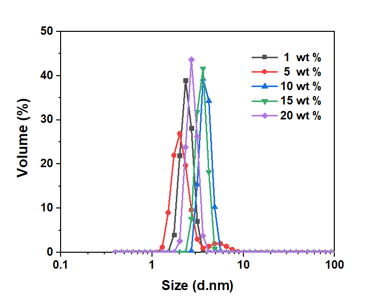 英文说明 : The volume based size distribution profiles of nanozirconia/silicone by using precursors with different zirconium n-propoxide contents (1, 5, 10, 15, 20 wt%).