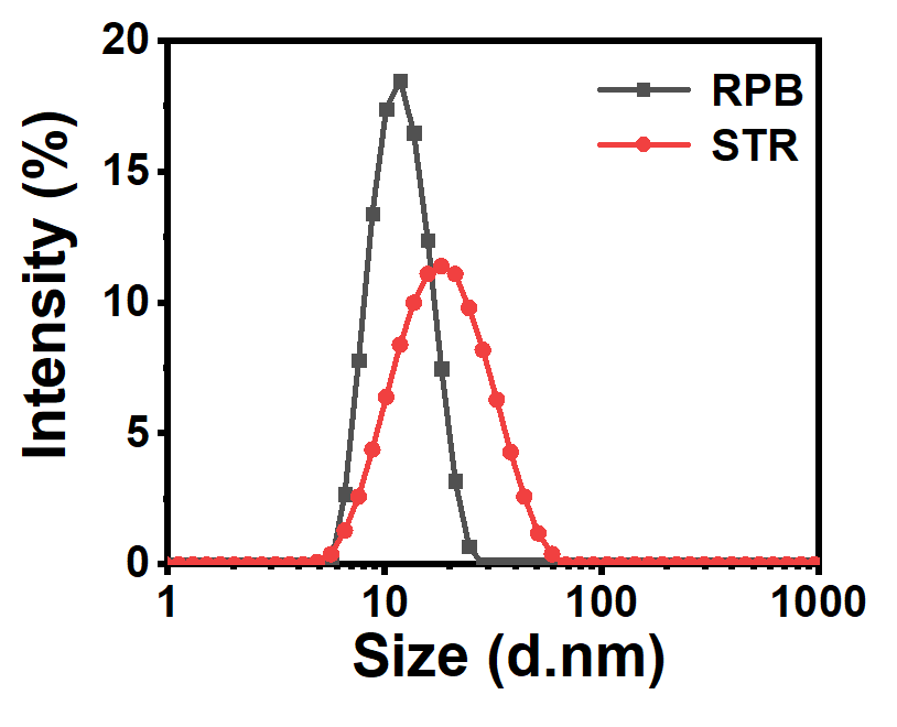 说明 : 转化STR路径获得的ZrO2@BA纳米颗粒的流体力学直径(STR-ZrO2@BA)和从RPB路线(RPB-ZrO2@BA)溶解在甲苯中通过DLS测量