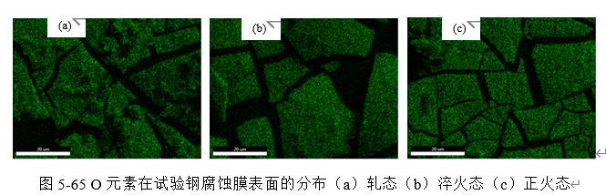 英文说明 : The distribution of O element on the corrosion film surface of the test steel (a) rolled state (b) quenched state (c) normalized state