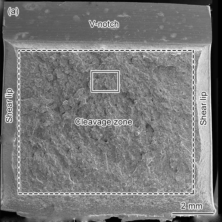 SEM images of impact specimens of the Ni-Cr-Mo-B ultra-heavy plate at 0T (a, d), 1/8T (b, e) and 1/2T (c, f) (The zones marked by dotted lines are cleavage areas. Figs.11d~f are magnified images of the zones marked by solid lines in Figs.11a~c, respectively)。