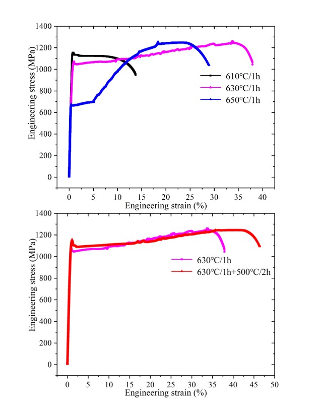 中锰钢轧制态630度配分拉伸曲线。工艺:①610度配分1小时;②630度配分1小时;③650度配分1小时;④630度配分1小时500度回火2小时。