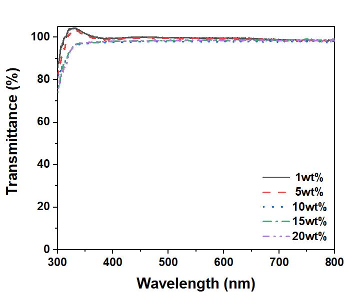 英文说明 : Transmittance of zirconia /AB resin films cured with different zirconium n-propanol additions (1-20wt%)
