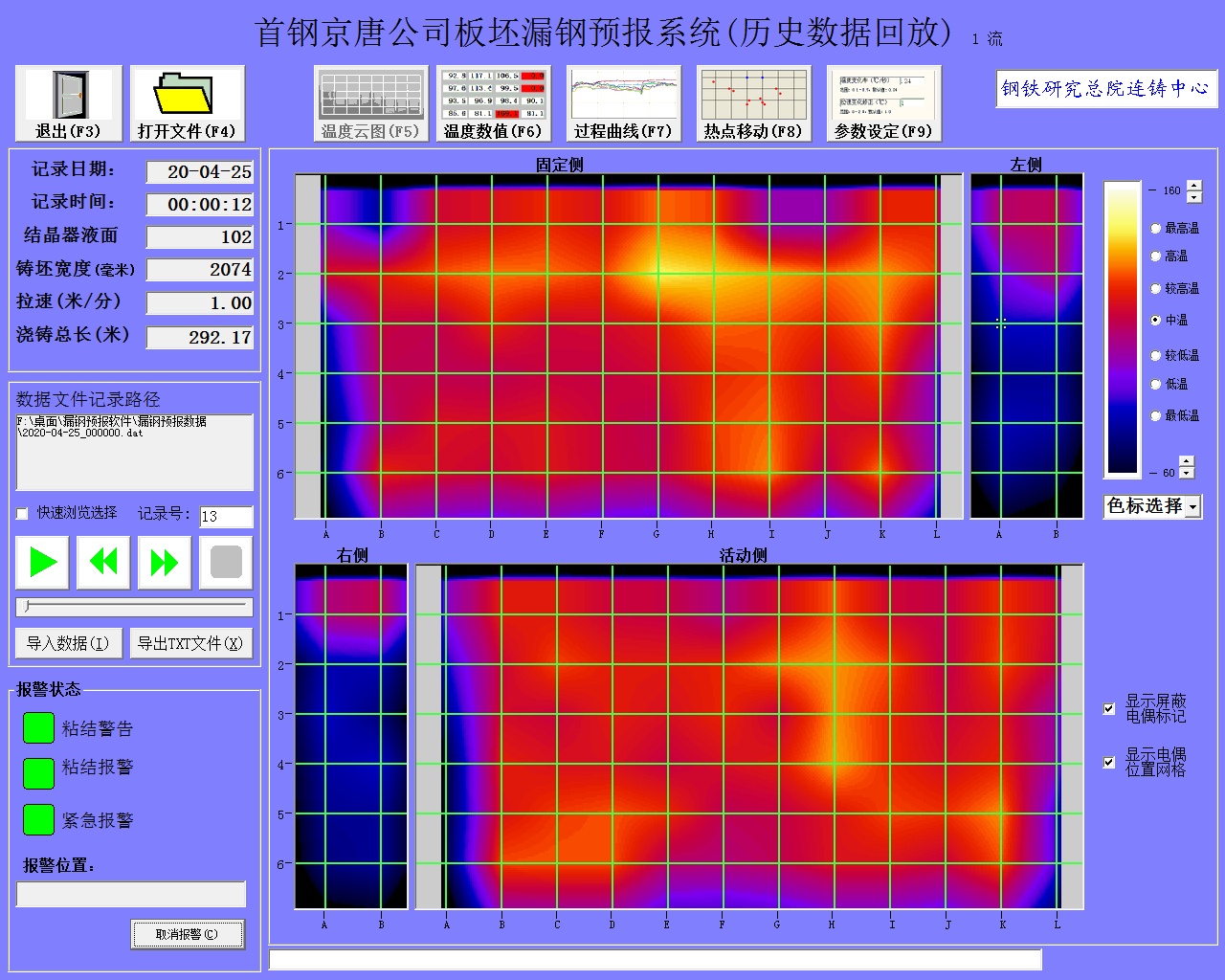 说明 : 2020-04-25 01:06:37 固定侧Ⅱ粘结报警G时和2020-04-25 01:16:39 活动侧紧急报警I时的热电偶温度变化现场数据。