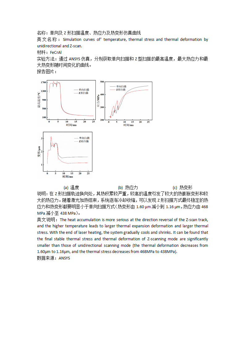The heat accumulation is more serious at the direction reversal of the Z-scan track, and the higher temperature leads to larger thermal expansion deformation and larger thermal stress. With the end of laser heating, the system gradually cools and shrinks. It can be found that the final stable thermal stress and thermal deformation of Z-scanning mode are significantly smaller than those of unidirectional scanning mode (the thermal deformation decreases from 1.60μm to 1.16μm, and the thermal stress decreases from 468MPa to 438MPa).