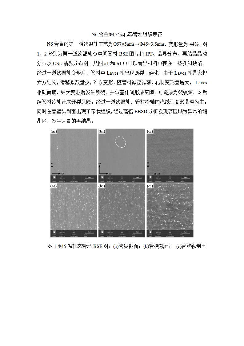 说明 : FeCrAl-N6合金Φ45温轧管材微观组织SEM表征