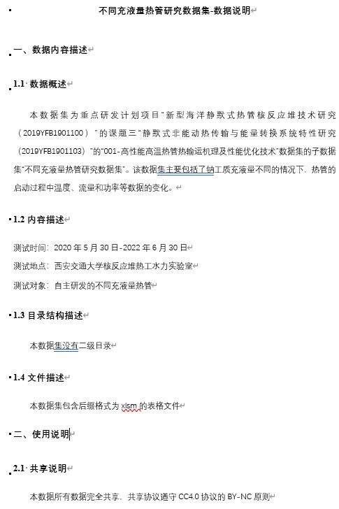 本数据集为重点研发计划项目“新型海洋静默式热管核反应堆技术研究(2019YFB1901100)”的课题三“静默式非能动热传输与能量转换系统特性研究(2019YFB1901103)”的“001-高性能高温热管热输运机理及性能优化技术”数据集的子数据集“不同充液量热管研究数据集”。该数据集主要包括了钠工质充液量不同的情况下,热管的启动过程中温度、流量和功率等数据的变化。