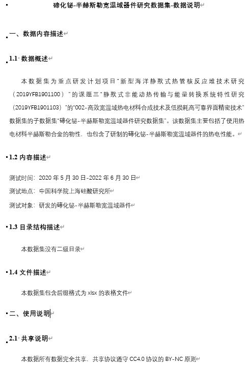 本数据集为重点研发计划项目“新型海洋静默式热管核反应堆技术研究(2019YFB1901100)”的课题三“静默式非能动热传输与能量转换系统特性研究(2019YFB1901103)”的“002-高效宽温域热电材料合成技术及低损耗高可靠界面精密技术”数据集的子数据集“碲化铋-半赫斯勒宽温域器件研究数据集”。该数据集主要包括了使用热电材料半赫斯勒合金的物性,也包含了研制的碲化铋-半赫斯勒宽温域器件的热电性能。
