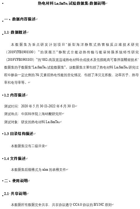 本数据集为重点研发计划项目“新型海洋静默式热管核反应堆技术研究(2019YFB1901100)”的课题三“静默式非能动热传输与能量转换系统特性研究(2019YFB1901103)”的“002-高效宽温域热电材料合成技术及低损耗高可靠界面精密技术”数据集的子数据集“La3SmTe4试验数据集”。该数据集主要包括了热电材料La3SmTe4研究过程中掺杂一定比例的Ni元素后热电性能的变化情况,包括了泽贝克系数、功率因子、热导率和电导率等。