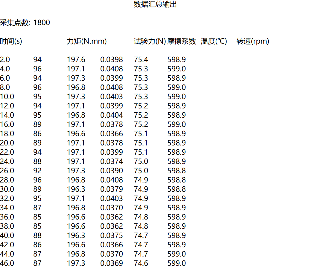 英文说明 : Summary and output of powder friction experimental data generated at 200℃ for 2h (time 1h, test force 196N, temperature 75℃, speed 600rmp)