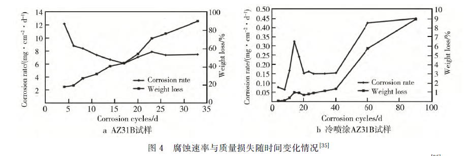 Diab 等人对冷喷涂铝涂层进行盐雾腐蚀研究,图3 为AZ31B 基体与冷喷涂试样在5%NaCl 盐雾腐蚀试验后的结果对比:相比于无Al 涂层保护的试样,冷喷涂纯铝涂层的试样的腐蚀速率大幅降低,而且在33 d 试验期内,Al 涂层可较好地保护镁合金基体。图4 为在腐蚀试验中的镁合金基体与冷喷涂试样的腐蚀速率与平均质量损失情况:40 d 前,冷喷涂试样的质量损失低于1.5%,且腐蚀90 d 后的质量损失仅为9%,远低于镁合金基体的质量损失。